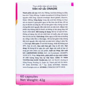 Công dụng: Onagre hỗ trợ điều trị các triệu chứng tiền kinh nguyệt và mãn kinh, đồng thời dưỡng da, chống lại quá trình lão hóa của tế bào, hỗ trợ duy trì và cải thiện sự trẻ trung và vẻ đẹp của làn da.